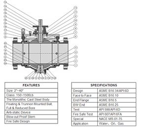 Features: one piece type body, emergency sealant injection, low emission packing, fire safe, anti-static and anti-blowout stem, valve seat function DBB, optional extended bonnet, cavity pressure self-relief.